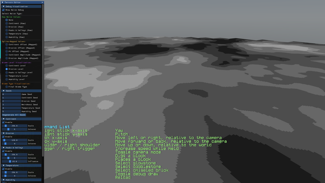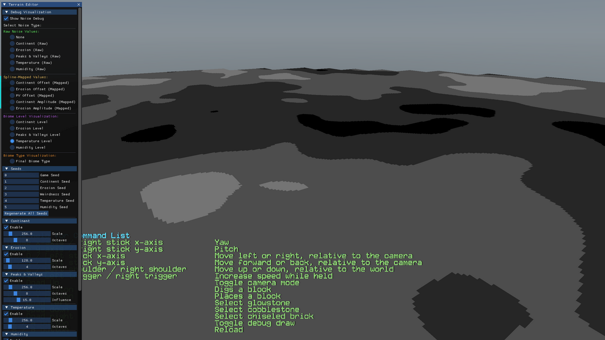 • Complex Terrain Generation: Biome-driven generation using continentalness, erosion, peaks/valleys, temperature, and humidity parameters with procedural tree placement